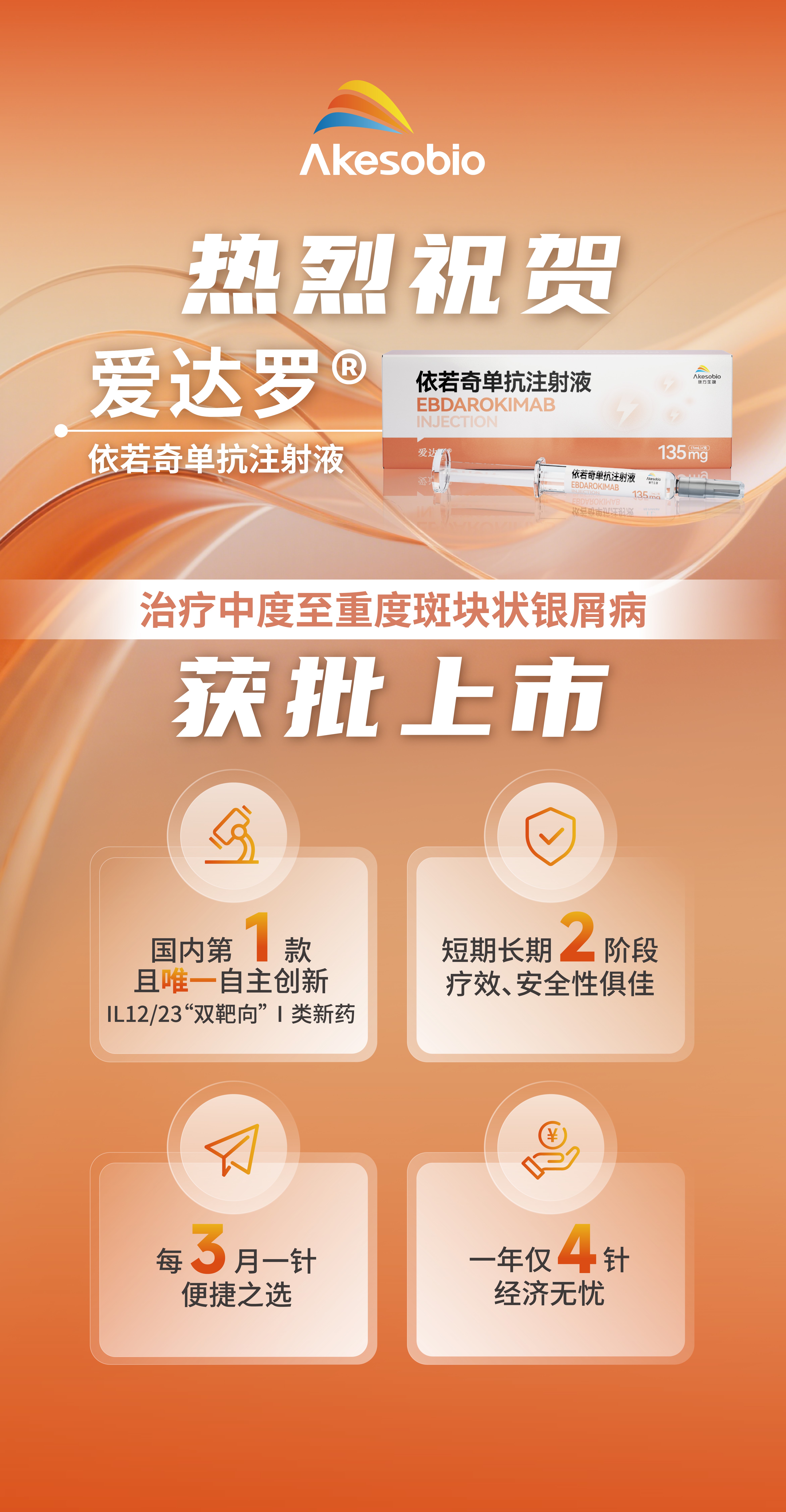 爱达罗®(依若奇单抗注射液)是公司自主研发的新型人源化IL-12/IL-23单克隆抗体新药,获得国家“重大新药创制”科技重大专项课题支持,主要用于治疗银屑病、溃疡性结肠炎和其他自身免疫性疾病。